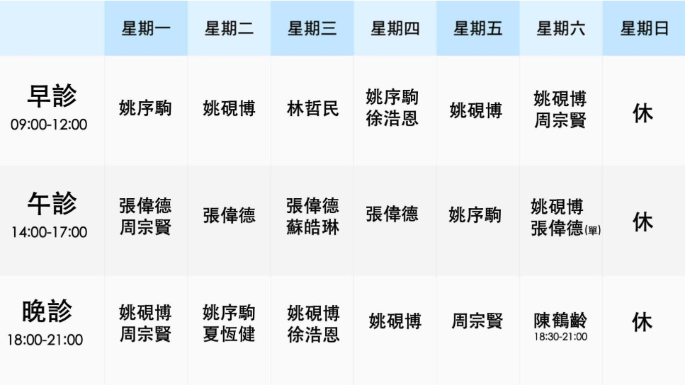 全時段門診安排:早、中、晚診皆有,適合各種生活型態的患者。